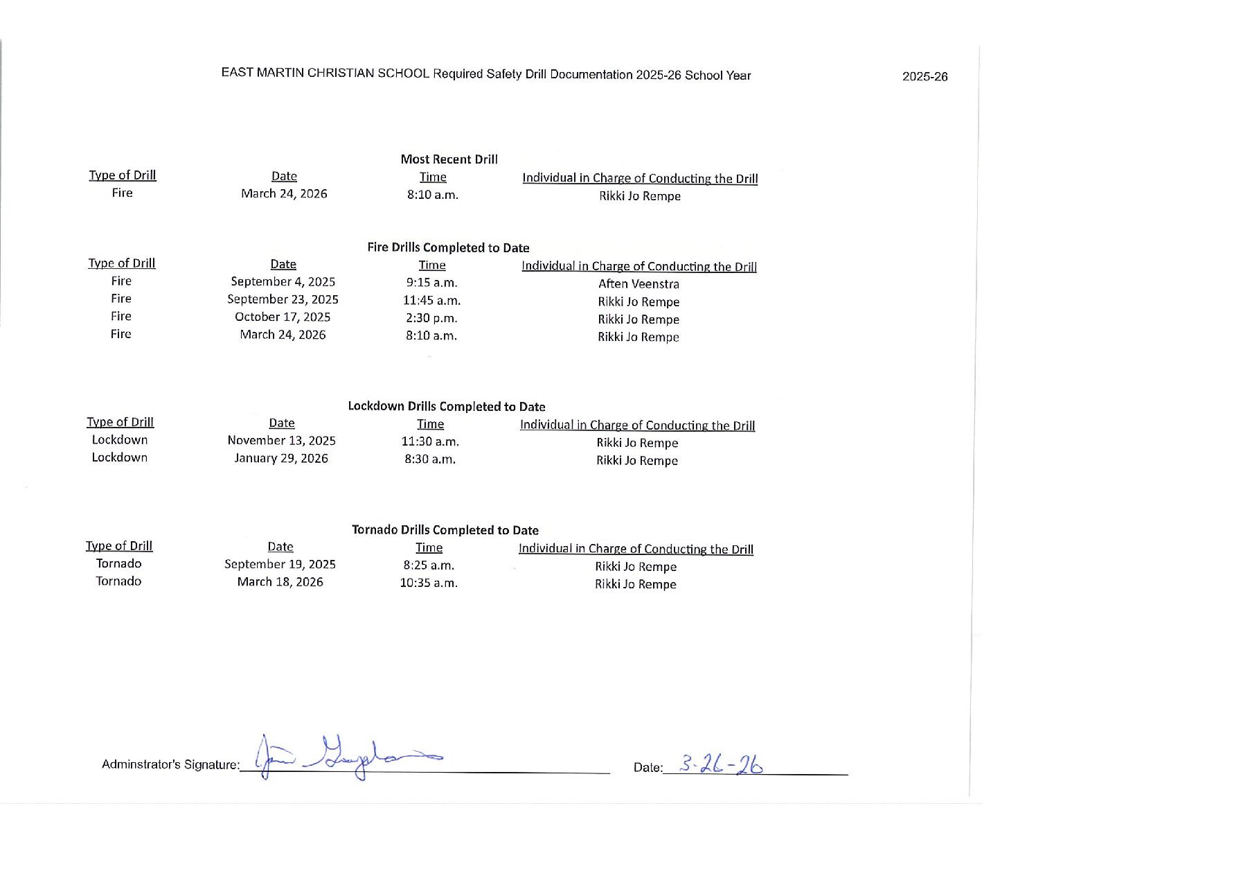 East Martin Christian School conducts safety drills for fire, tornado, and lock down/shelter in place situations. These reports are posted after the drills.